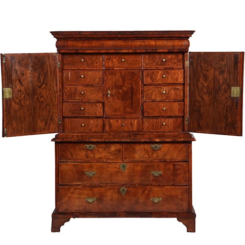 Een rariteitenkabinet of, zoals de Engelse zeggen: A chest on a chest. In een uitzonderlijk fraaie kwaliteit gemaakt, prachtig donker gebleven wortelnoten prachtig hang en sluitwerk. In de fries een verdekte lade die vrijwel onzichtbaar is. Achter de deuren een interieur met 11 laden en een deurtje. Achter dit centrale deurtje nog eens 6 kleine laden ruimte voor andere kostbaarheden.