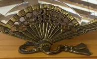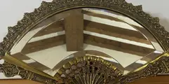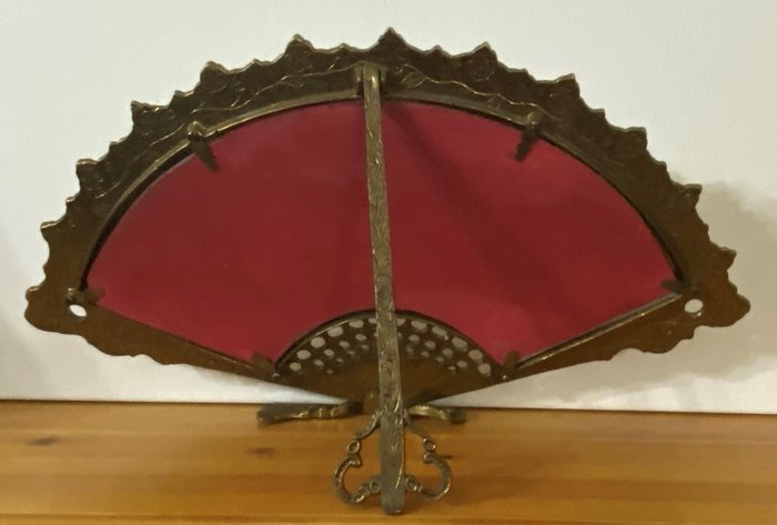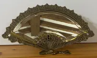 Antieke, Vintage mooie spiegel van brons in de vorm van een dameswaaier met een voet in de vorm van afgeschuinde kwast.