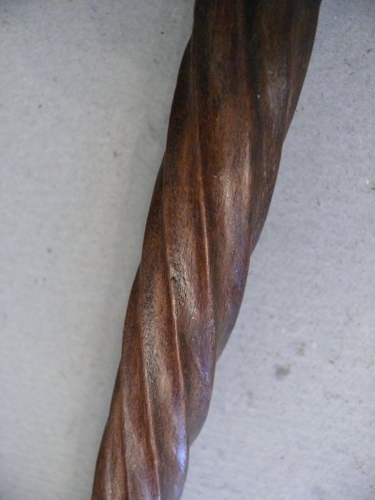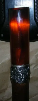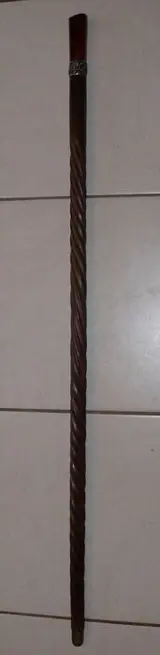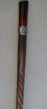 Schitterende art-decostok, bakelieten amberkleurige knop (misschien Faturan), witmetalen ring versierd met bloemen, gedraaid gesneden rood hout.