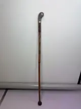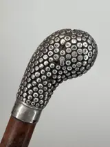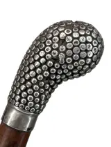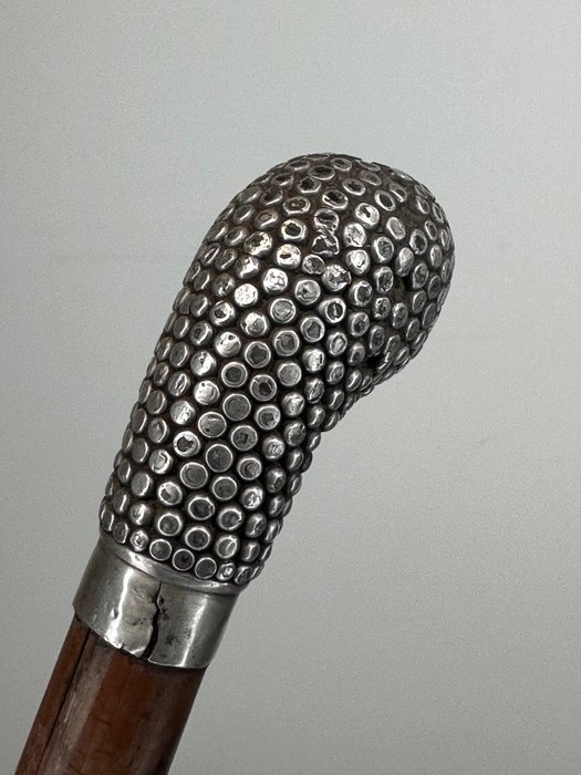 Een bamboe wandelstok met een zilveren 'club' als pommel. Zilver gekeurd, 800/1000 en een onduidelijke zilversmid stempel.