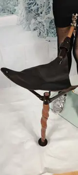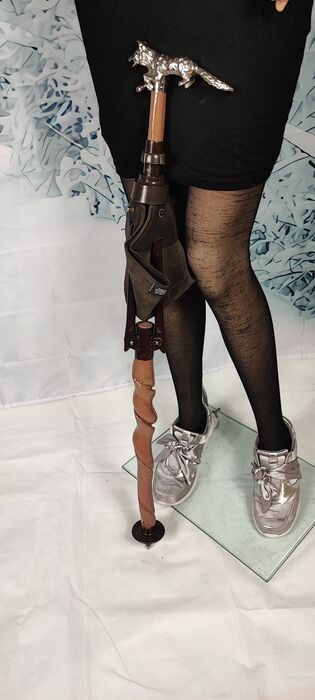 Mooie, handgemaakte wandelstok. De stok is gemaakt van beukenhout met een gedraaid schot. Door het stevige rundleer en het ijzeren frame zit je veilig en comfortabel op een hoogte van ca. 65 cm. De stok heeft een lengte van 92 cm. De vos is gemaakt van zilverkleurig messing en de voet is een Spreidpunt die wegzakken voorkomt. Eenmalig.
