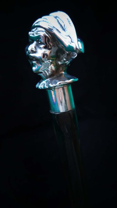 Een 925 zilveren en houten wandelstok. Handvat ontworpen als Harlequin (Arlecchino in het Italiaans), gemaakt van zilver. Zwarte houten stok.
