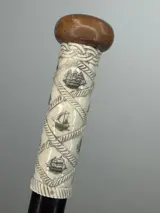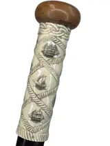 Een wandelstok met een langwerpige benen greep (11cm) met graveringen van schepen en zeilboten. Heeft een houten knop (vruchtenhout).