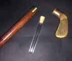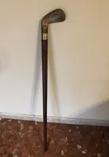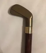 Antieke houten wandelstok, met interne drankfles, met messing golfclubkop.