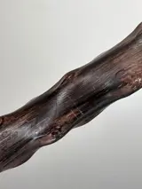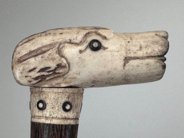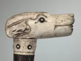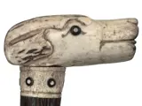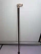 Een coromandel wandelstok met een benen ferrule (=uiteinde sok) en een benen manchet (=band tussen stok en greep). Greep is handgesneden uit gewei van een hert in vorm van een hond (terrier).