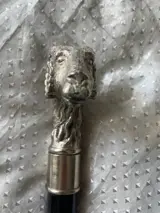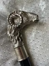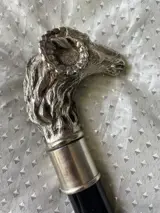 Stevige Italiaanse wandelstok met verzilverde ramskop en zwartgelakte beukenhouten ton.