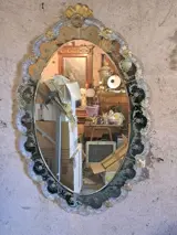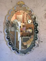 Spectaculaire spiegel van Muranoglas met originele kwikspiegel, zoals te zien op de foto's, spectaculaire glaslijsten in diverse uiterst waardevolle kleuren, allemaal verrijkt met bloemen van Muranoglas in diverse kleuren, zoals op de foto's te zien is. De spiegel is wat dof geworden, wat duidelijk te maken heeft met het soort materiaal waarvan hij is gemaakt.