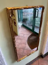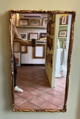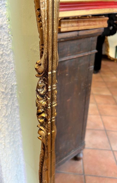 Te koop een zeer verfijnde spiegel in handverguld hout met 18 karaats bladgoud.