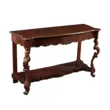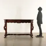 Louis Philippe Napolitaanse console, ondersteund door staanders, waarvan de voorste bewogen zijn en rijkelijk gebeeldhouwd met bladelementen en kariatiden; de poten zijn verbonden door een gevormde plank. Aan de voorkant en aan de zijkanten is het schort versierd met kleine raampjes die zijn uitgesneden met plantmotieven.