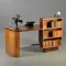 Bureau of schrijftafel met een geïnterfereerde kleine boekenkast in noten, wortelnoten en palissander gecombineerd met metalen grepen op de laden, een kleine metalen poot onder het ladenblok en een metalen buis als voetensteun. Links 4 laden, aan de achterzijde een openboekenkast met drie schappen.