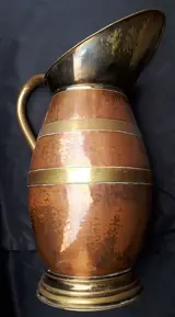 Grote stevige waterkan in geslagen rood en geel koper, ca. 1880, België.