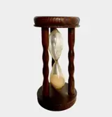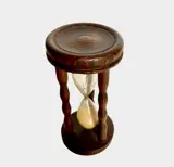 Zandloper, Frankrijk, begin 19e eeuw. Van kleine afmetingen. Geblazen glas en hout. Goede staat, ondoorzichtigheid op de ramen door gebruik, houten steun in goede staat. 3 minuten ongeveer. 10,5 x 5 cm.