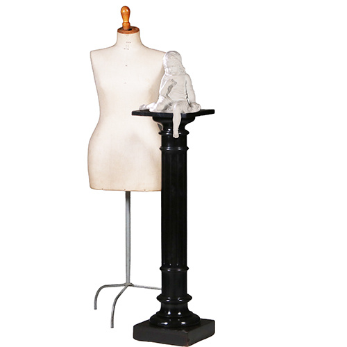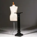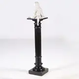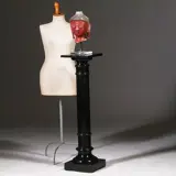 Zwart gepolitoerde houten Dorische pedestal of zuil met cannelures. Een strakke ronde gedraaide zuil met vierkante voet en met een eveneens vierkant blad. De stam met cannelures. Het geheel zwart glanzend gepolitoerd met een aangename oude look passend bij de tijd.