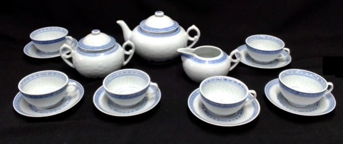 17- delig chinees porcelein theeservies met rijstkorreldecor.