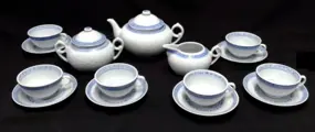 Op de randen van alle serviesdelen is een blauwe bies aangebracht met een sier motief.