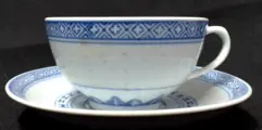 Niet antiek. Leeftijd onbekend.(Rijstkorreldecor:In het porcelein is in een dunnere licht doorschijnende porceleinsoort de afbeelding van rijstkorrels aangebracht die het best tot recht komt als het object tegen nhet licht wordt gehouden.)