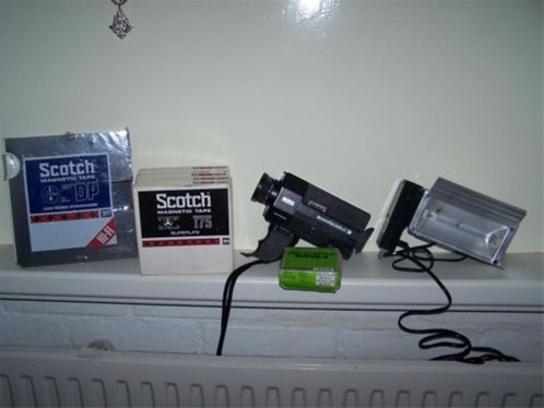 Complete Eumig opname set: Eumig mini 3 camera, Eumig filmlamp, 5 blanco films Scotch 175 mtr, 1 blanco film Scotch 720 mtr., 1 opname cassette Peruchrome S8 15 mtr.Alles in etui en tas.