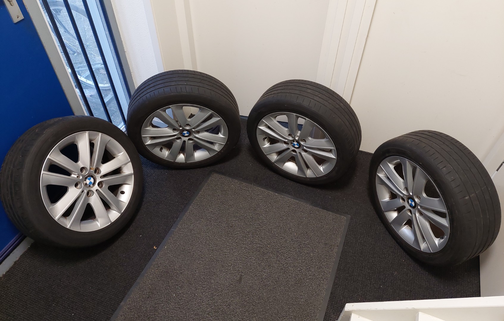 4 lichtmetalen velgen 5 gaats met Hankook Prime 3 zomer banden 205 50R 17 93V. Profiel banden ca. 5 mm. Velgen hebben normale gebruikssporen, maar geen stoeprandschade. Vlekjes op sommige foto's komen van tl verlichting. Velgen hebben onder een BMW 1-serie gezeten.