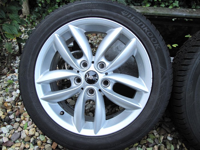 4 Mini velgen, 17 inch, 5 gaats met goede winterbanden.