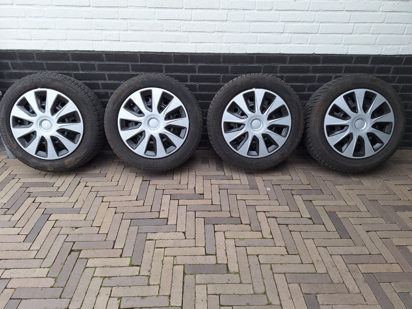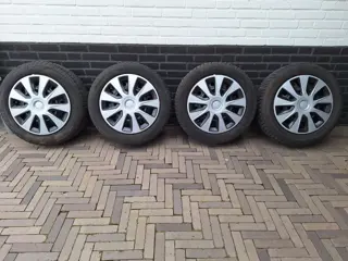 Vier winterbanden inclusief stalen velgen met bandenspanningssensoren en bijbehorende wieldoppen.