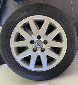 4 Volvovelgen met zomerbanden. Velgen zien er goed uit, banden kunnen nog even mee.