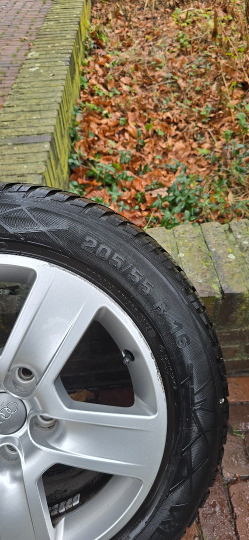 winterbanden op lichtmetalen velg. vredestein wintrac205/55 r16 heeft onder een audi a3 gezeten van 2019 maar zou ook onder andere volkswagens kunnen met dezelfde steekmaat. twee banden rond de 5mm en twee banden rond de 7 mm profiel zie foto's