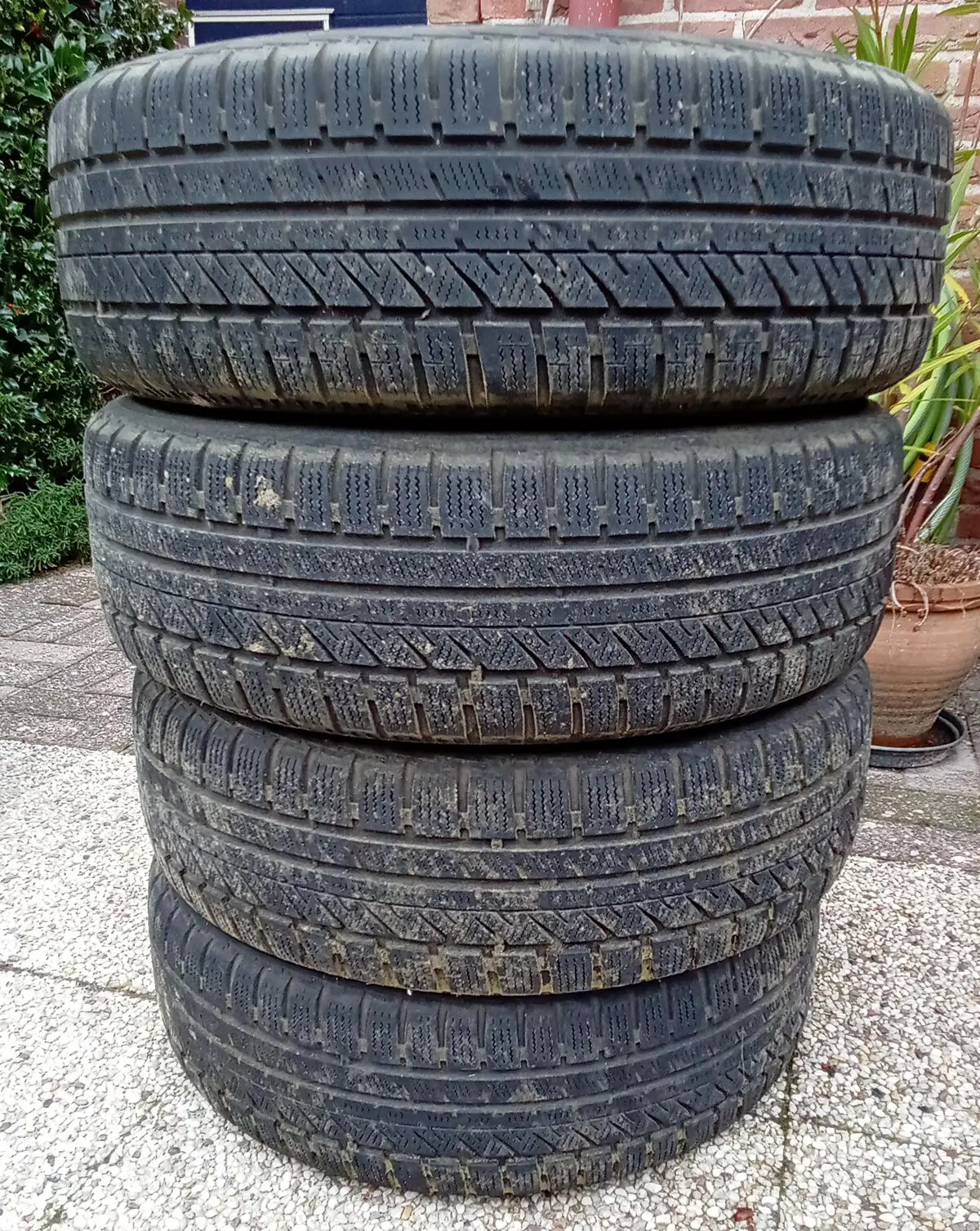 Set van 4 gebruikte nog goed bruikbare winterbanden van het merk Bridgestone. Maat 185/60R15. Geschikt voor diverse merken personenwagens. Met wieldeksels en door de opvulplaten (spoorverbreders) snel passend