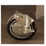 op 4 wielen, waarvan 2 zwenk en 2 geremd.