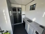 Living is o.a. voorzien van: Keukenblok met spoelbak, schoon- en vuilwatertank, Koelkast met vriesvak, Inductiekookplaat, 220V walstroomaansluiting + Victron omvormer, Porta Potti toilet (mobiel), afspuitinstallatie voor paarden, grote opbergkast en uitneembare opstap, etc. etc.