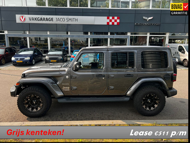 Mooie jeep Wrangler 2.2D Sahara uit 2019 staat nu op grijs kenteken. terug zetten naar geel kenteken is mogelijk waaronder het lederen interieur met stoelen op de achterbank en originele wielen.