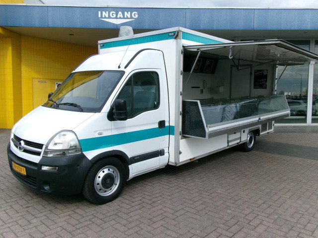 COXX R4.2-35 Vis verkoopwagen foodtruck op basis van Opel Movano (zelfde als Renault Master), ook voor andere verkoop doeleinden geschikt, grote luifel, uitschuifbare glazen vitrine met koeling, boiler voor warm water, damp gastank, 3-zits, distributieriem recent vervangen.