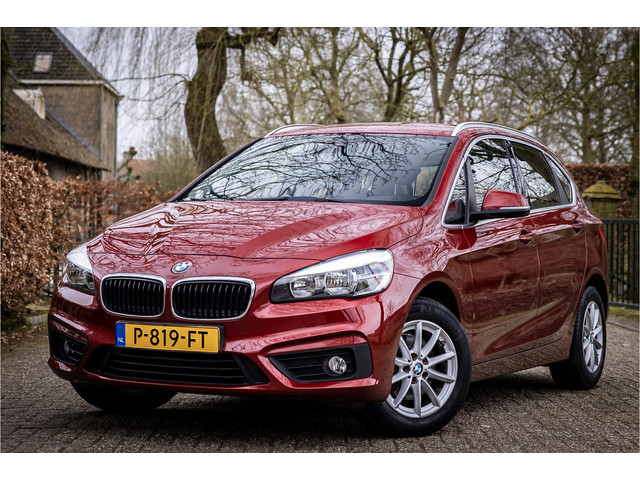 Keurige BMW 218i Active Tourer met zuinige benzinemotor. Lakkleur is Flamencorot Metallic en het interieur is voorzien van zwart stof.