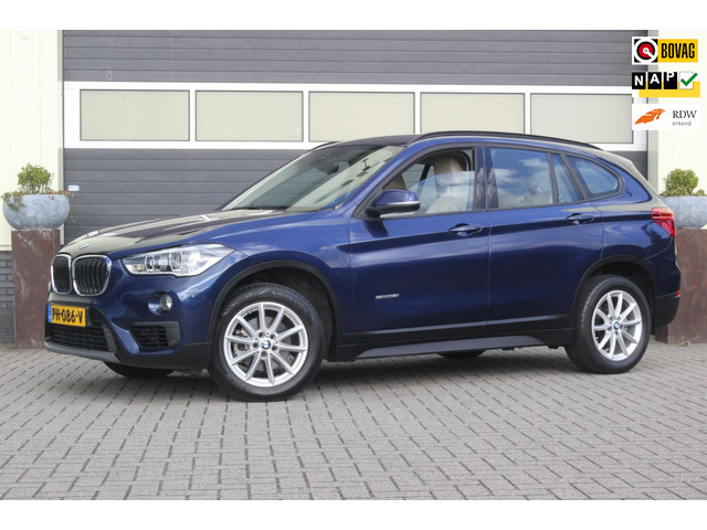 Zeer fraaie BMW X1 18i sDrive High Executive uit 07-2017 in prachtig C10 Mediterran-blau metallic lakwerk over Dakota Canberra-beige lederen bekleding.