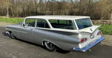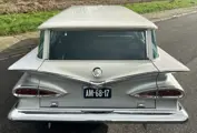 Deze Chevrolet Brookwood Wagon is zeer zeldzaam en gewild in deze tweedeurs uitvoering. De Chevy is bovendien uit bouwjaar 59, wat volgens de kenner toch wel de mooiste uitvoering is met de specifieke 59 angel eyes achterlichten en ronde vleugels achterop. De Chevy is jaren geleden zeer grondig body-off gerestaureerd. Dat is goed zichtbaar aan onderzijde waar alles nieuw is en mooi in de lak staat. Destijds is technisch ook alles vernieuwd zoals de schokbrekers, stuurhuis, stuur- en fuseekogels, Wilwood remmen voor, etc. Er is een airride systeem. De originele 283 is vervangen voor een Chevy 454 in combinatie met een TH350 automaat. Hij staat op gepolijste Toque Trust velgen van 20 en 19” met goede banden. Het interieur is helemaal Kustom gemaakt en erg mooi. De deurpanelen, het tapijt, de headliner en de banken verkeren bijna in perfecte staat, alleen de voorbank aan de bestuurderskant heeft een slijtplek. De auto heeft stuurbekrachtiging, rijdt als nieuw en de uitlaat maakt een prachtig stoer geluid. De motor is krachtig maar de exacte PK’s zijn niet bekend, er zijn nogal wat varianten van de 454.