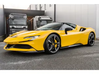 Het door ons aangeboden exemplaar is een bijzondere verschijning in het iconische 'Giallo Modena' met een lederen ‘Nero’ interieur en met de juiste opties zoals carbon interieur en exterieurdelen, head-up display, carbon racestoelen, titanium wielbouten, een 'Nero DS’ livery en het gewilde Assetto Fiorano Package! Het Assetto Package bevat andere schokbrekers, meer carrosserie delen vervaardigd uit carbon, een titanium uitlaat en veren, een achterklep met spoiler (voor meer neerwaartse druk) en motorkap afdekking van plexiglas. Dit totaal zorgt voor een nog beter sturende SF90 die ook nog eens 30 kilo lichter is!