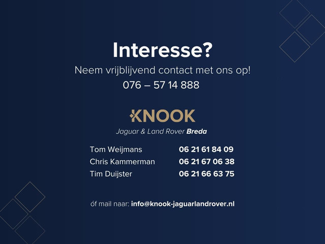 Dit afleverpakket bevat: Jaguar Approved; BOVAG 40-Puntencheck; BOVAG Afleverbeurt; Nieuwe APK; Geldige APK, RDW-leges