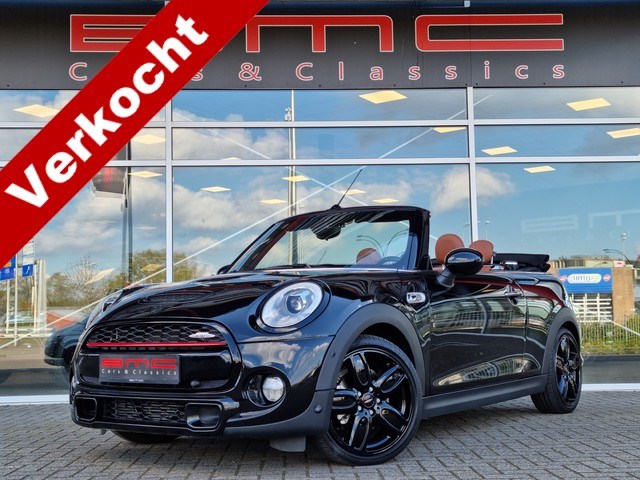 Schitterende Mini Cooper S Cabrio in midnight black metallic met een Chester malt brown lederen interieur.