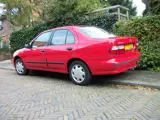 Keurige rode Nissan Almera Sedan met automaat en airco.