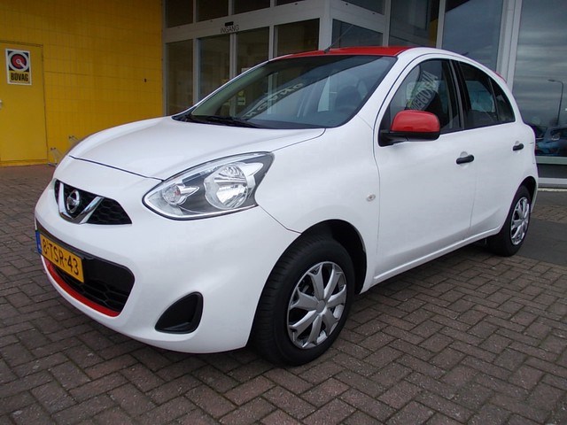Nissan Micra 98 pk (72KW) colour-line in de 5-deurs uitvoering, airco, dubbel DIN radio, nette en frisse auto, wit met rode accenten en rood dak.