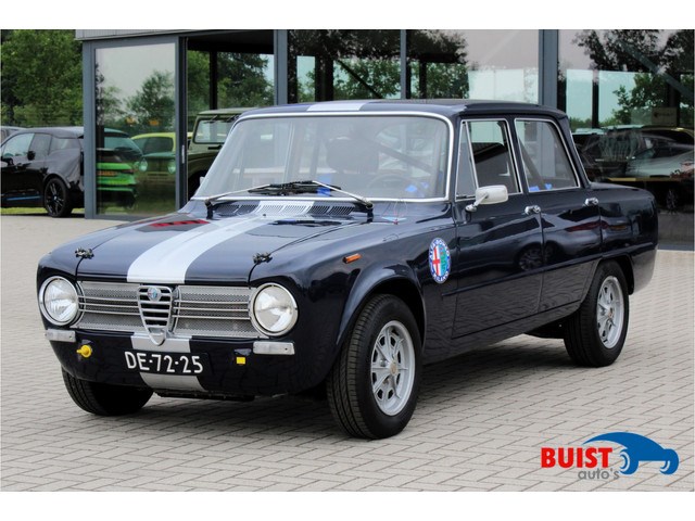 Schitterende Alfa Romeo Giulia 1300 Ti van 1970! Deze Giulia is bijzonder geschikt voor klassieke rally's of desgewenst trackdays, de Giulia is voorzien van sportstoelen, rolkooi en 4-punts gordels, enkel de tripmaster zou nog kunnen ontbreken. De Giulia is vrijgesteld van APK en wegenbelasting (53 jaar) en verkeerd in absoluut roestvrije conditie, sinds de jaren 90 heeft de Alfa in een privecollectie verwarmd binnen gestaan. De auto is recent voorzien van 4 nieuwe Continental banden, groot onderhoud met o.a. nieuwe bougies, remklauw revisie, brandstoftank gereinigd en verse V-Power van Shell getankt, NOS midden en einddemper, bak- en caranolie ververst, cardan keerring vervangen, nieuwe koppeling, druklager en drukgroep en een complete versnellingsbak revisie. Recent taxatierapport van € 23.500,- aanwezig. Inruil van moderne auto's en klassieke auto's mogelijk.