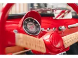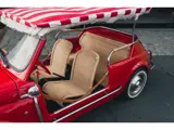 De auto is gespoten in een prachtige zachte roodtint met een vleugje perzik — een kleur die perfect past bij het zomerse karakter van deze klassieke Fiat. Het interieur is voorzien van stijlvolle rieten stoelen en een speels zonnedakje met witte franjes, helemaal in lijn met de iconische Jolly-stijl.