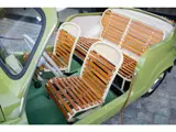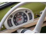 De carrosserie is uitgevoerd in een frisse, elegante groentint die prachtig contrasteert met de crèmekleurige accenten op stoelen en dashboard. De donker afgelakte houten lattenstoelen geven het interieur zijn mediterrane signatuur. De instap is afgewerkt met sierlijke koorden, achterop bevindt zich een klassiek mandje en de groene rubberen vloerbekleding zorgt voor een subtiele, stijlvolle basis.