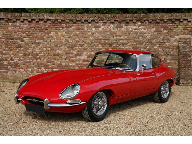 Zo'n vijftien jaar geleden werd deze E-type tot in de kleinste puntjes en tot het hoogste niveau gerestaureerd. De vorige eigenaar heeft de auto zeer lang in bezit gehad. De E-type is uitgevoerd in Carmen Red, over een zwart lederen interieur. Prachtig lakwerk sier de E-type, waarvan de carrosserie ook onder de lak in formidabele staat is. De passingen zijn fantastisch, portieren en scharnierende delen sluiten optimaal. Letterlijk schitterend chroom completeert de uitzonderlijke staat van deze auto.