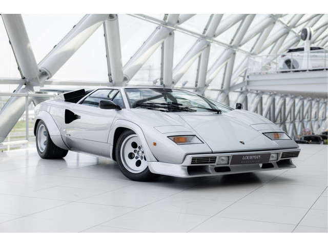 De carrosserie is uitgevoerd in de originele Lamborghini-kleur Argento Metallizzato, een zilvergrijze tint die de scherpe lijnen van Marcello Gandini’s ontwerp onderstreept. In combinatie met de iconische vleugeldeuren en de klassieke Campagnolo-velgen presenteert de auto zich als een rijdend sculptuur: een ontwerp dat zelfs stilstaand snelheid en kracht uitstraalt.