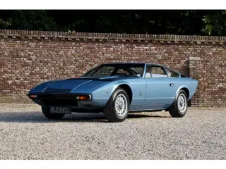 Dit specifieke exemplaar, gebouwd in 1976, is gespoten in de prachtige kleur Blu Metallizzato en voorzien van een zwart Connolly leren interieur. Daarnaast is deze Maserati volledig gerestaureerd door de eigen Maserati Classiche afdeling. De schitterende carrosserie verkeert in goede staat en de lak schittert ons tegemoet. De kwaliteit van deze restauratie werd goed uitgevoerd. De passingen van de carrosseriedelen zijn fraai en in het interieur zien we nog veel originele details. Deze Khamsin is bovendien decennialang gekoesterd door een ware Maserati kenner, als onderdeel van een uitgebreide Maserati-collectie.