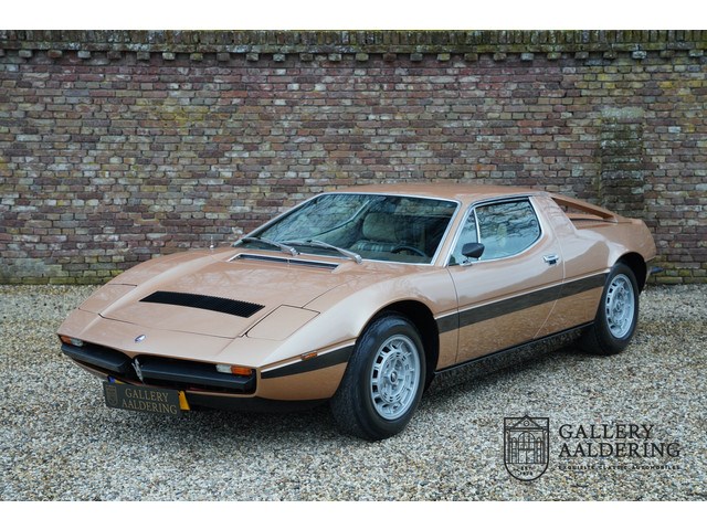 En zo'n zeldzame 2000 GT staat nu in Brummen, nog inclusief de zwarte banen op de zijkanten. Deze werden vaak vakkundig geëlimineerd om te verdoezelen dat het om een 2-liter ging maar de eigenaar van dit exemplaar liet ze gelukkig zitten. De 2000 GT was speciaal ontwikkeld voor de Italiaanse markt dus in Nederland was deze uitvoering niet of nauwelijks leverbaar. Deze gouden Merak, samen met blauw metallic overigens de enige leverbare kleuren op de 2000 GT, werd in 1981 de fabriek uitgereden en kwam in 1986 naar Nederland. In 1995 ging de Merak naar de volgende Nederlandse eigenaar, van wie de meest recente eigenaar hem in 2021 overnam. Een kraakhelder verleden dus, waarbij ook de auto zelf duidelijk laat zien in wat voor staat hij verkeert.