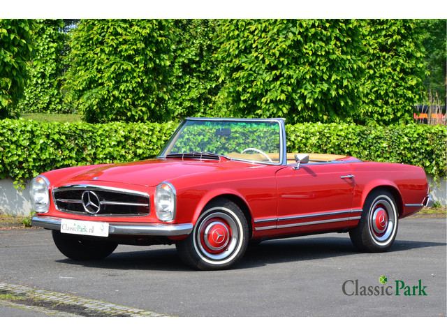 De rode frisse lakkleur, de zwarte softtop, het tan-kleurige interieur en het witte Mercedes-Benz-stuurwiel passen uitstekend bij dit model en maken deze Pagode zeer attractief. Deze SL is bovendien voorzien van een derde zitje achter de voorstoelen. Het betreft een vroeg exemplaar met een staand reservewiel in de kofferruimte. En, nòg leuker: het is een handgeschakelde uitvoering.