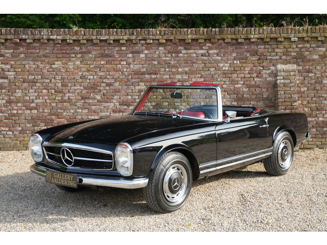 Voor de kenners:, de V-markeringen in de voorspatborden zijn aanwezig. En deze Pagode is uitgerust met de handgeschakelde versnellingsbak zoals echte liefhebbers hem het liefst hebben. Voeg daaraan toe het tijdloze kleurenschema van zwart met donkerrood leder en u begrijpt: dit is een Pagode zoals we hem graag zien.