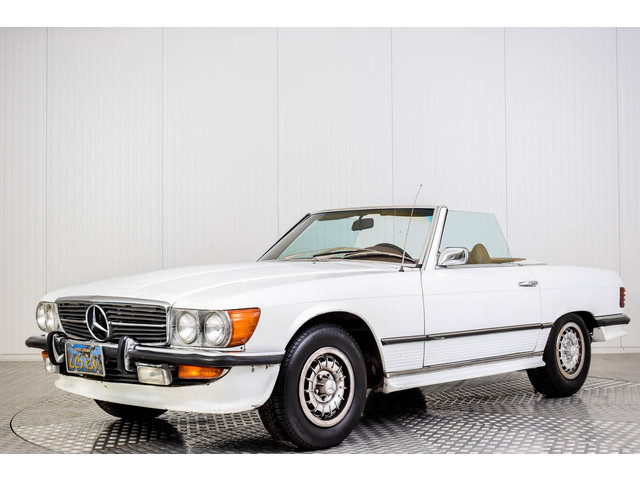 Stevige 8 cilinder Mercedes 350 SL van bouwjaar 1972, het gewilde model met de smalle bumpers! Betreft een zeer originele, complete en gave import vanuit de Amerikaanse staat Californië waar auto's dankzij het gunstige klimaat aanzienlijk beter bewaard blijven. Deze Benz is voorzien van een softtop maar ook van de originele hardtop. Importdocumenten zijn aanwezig evenals de Amerikaanse registratie title, de importbelastingen zijn reeds betaald. De Mercedes-Benz W107 serie (officieel bekend als R107 voor de roadster en C107 voor de coupémodellen) werd geproduceerd van 1971 tot 1989 en is daarmee naast de G-serie het Mercedes-model dat het langst in productie is geweest. In totaal werden er zo'n 237.000 exemplaren gemaakt. De R107 verving de W113 (Pagode) in 1971 . De productie startte in april 1971 en leverbaar was alleen de 350SL (BM107.043) en 350SLC (BM107.023) met 3.5 liter V8 (M116), elektronische brandstofinjectie (Bosch D-Jetronic) en een handgeschakelde 4-gang of een 3-gang automatische transmissie als optie. De motor leverde een vermogen van ca. 200 pk (5800 rpm) en een koppel van 286 Nm (4000 rpm). De SL-modellen werden geleverd met een linnen dak en als optie was er een stalen afneembare hardtop leverbaar. Er was ruimte voor twee volwassenen en twee kinderen (2+2).