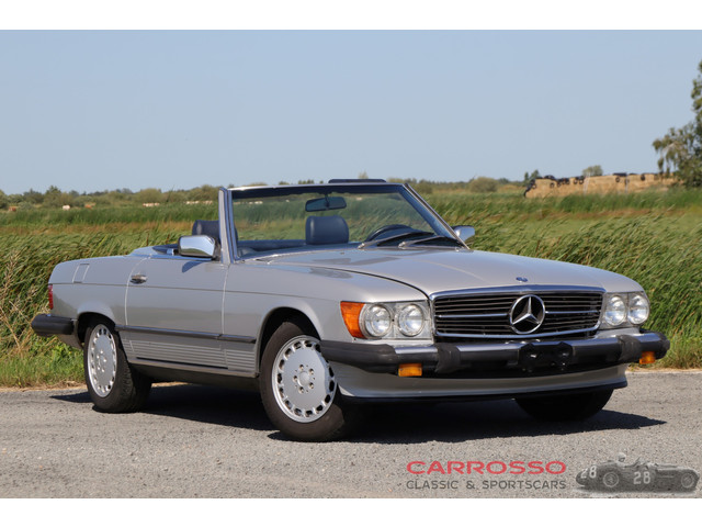 Het gaat hier om een Mercedes-Benz SL 560 uit 1987. De 560 staat voor de 5.6 liter inhoud van de motor, een V8. Hiervan zijn er nog geen 50.000 stuks geproduceerd, en waren alleen uitsluitend leverbaar aan de Amerikaanse, Japanse en Australische markt. Onze desbetreffende Amerikaans-model cabriolet is uitgevoerd in een nette 'Astral Silver Metallic' tegenover een 'Royal Blue Leather' interieur. Voor de rest is het interieur blauw velours bekleed samen met witte hemelbekleding, elektrische ramen & spiegels, houten middenconsole, achterruitverwarming en zijn originele Becker Grand Prix radio.